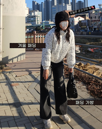 기본 아이템 같은 패딩은 많아서 화려한 패턴에 패딩을 구입해봤어요. 흰색이고 사이즈는 s/m/l 까지 있는데 저는 가장 작은 s사이즈를 구입했고 코드 안에도 입을 수있고 안에 니트 입고도 입을 수 있는 딱 좋은 사이즈 입니다.